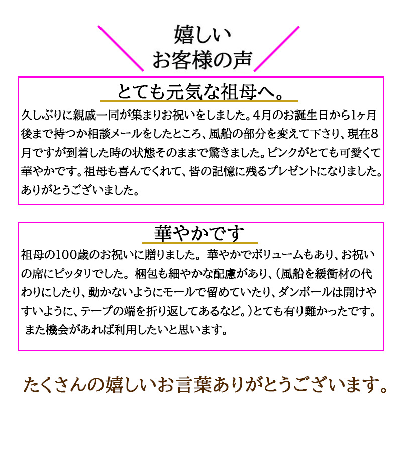 長寿の代名詞『百寿』。百のももから桃色をシンボルカラーとします。ご高齢であることを考え、紀寿・百寿を迎える大切な方のご健康を考えて目を楽しませてくれる贈り物がご家族の方も喜んで頂けるかもしれないですね。