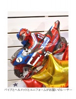真っ赤なバイクってかっこいいです!憧れます。今回はレーサー系のバイクに乗るバルーンになっています。レース仕様のオートバイがとってもかっこよくて速そう。載ってるレーサーも同じカラーリングでマッチしてますね。