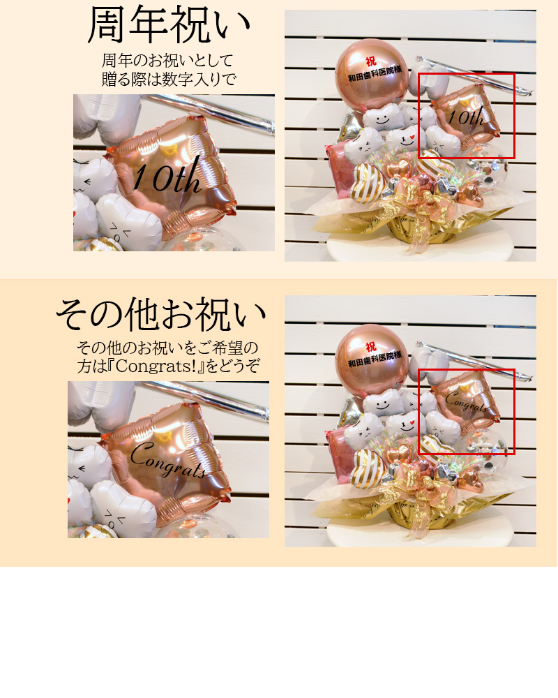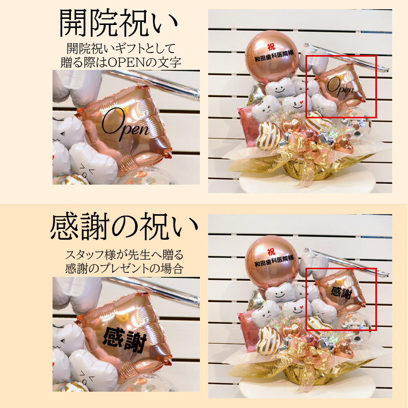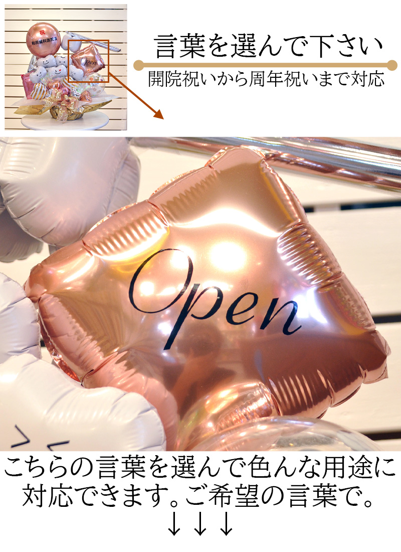 スクエアのバルーンの文字は選ぶことができます。開院祝いでは『OPEN』をお選びください。周年祝いではご希望の数字をお選びくださいね。その他ご希望の言葉がございましたらスタッフまで直接お問い合わせください。