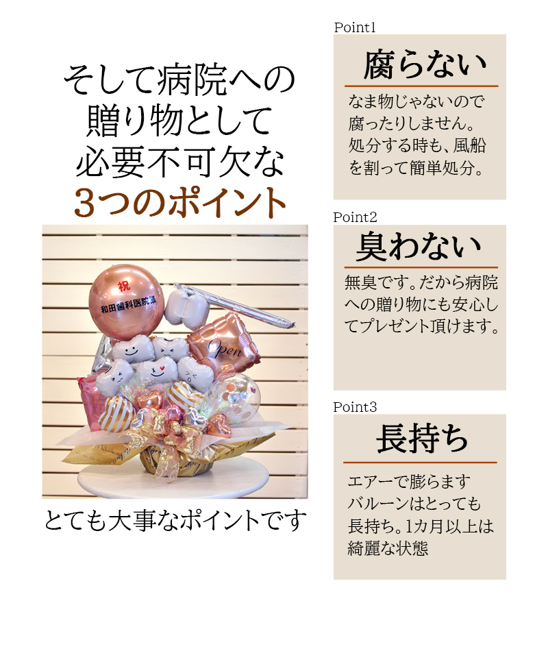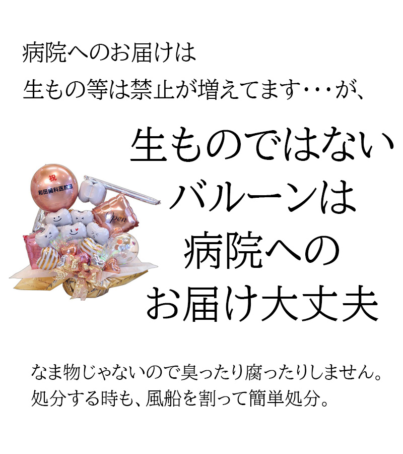 最近では病院のお見舞いなどに食べ物、生もの、お花などが禁止されているところが増えてきました。生ものであるからの弊害があるからのようですが、その点バルーンは安心。腐らない!臭わない!長持ちの3つのポイントが問題解決です!