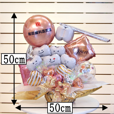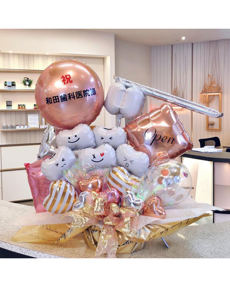歯医者さんの開院祝い、また周年祝いにご利用頂けるバルーンアレンジが登場です。最近はとてもオシャレな歯医者さんも多いですね。そんな素敵な歯医者さんでも可愛く飾っていただけるようナチュラルな色合いで作ったアレンジになっています。派手すぎないけどちゃんと目立つ。その他のアイテムも魅力いっぱいな豪華なアレンジですよ。