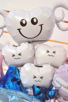 歯医者さんの開院祝い、周年祝いのバルーンギフトです。泣き顔のいたそうな歯の3兄弟を助けるのは笑顔の歯の天使ちゃん。天使ちゃんは特別な歯ブラシのバルーンを一緒に助けに来ました。ポップでカワイイ歯医者さん用のプレゼントです。