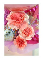 母の日のプレゼントです。気球バルーンタイプで母の日用のバルーンやカーネーションのシルクフラワーなどを入れました。生ものを使っていないので腐らない、臭わない、手入れがいらない、箱から出してすぐ飾れる嬉しいプレゼントです。