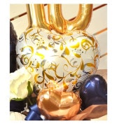 数字のバルーンが選べるアレンジメントになります。クラシカルな雰囲気で周年祭などにご利用いただけます。ネイビーとゴールドって相性のいい色合いだと思うんですよね。大人っぽくて、ゴージャスで。派手な雰囲気じゃないのでひっそりと飾ってもらい方にはおすすめですね。