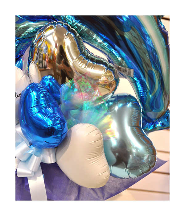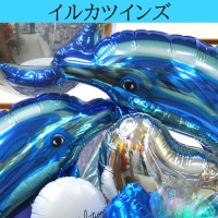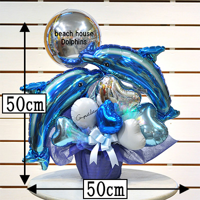 綺麗な青色で描かれた2頭のイルカのバルーンです。夏になると特に人気のこのイルカたちは、海のお祝いで良くご利用いただいている人気者。涼しげな様子もあって夏のお祝いにぴったりですね。