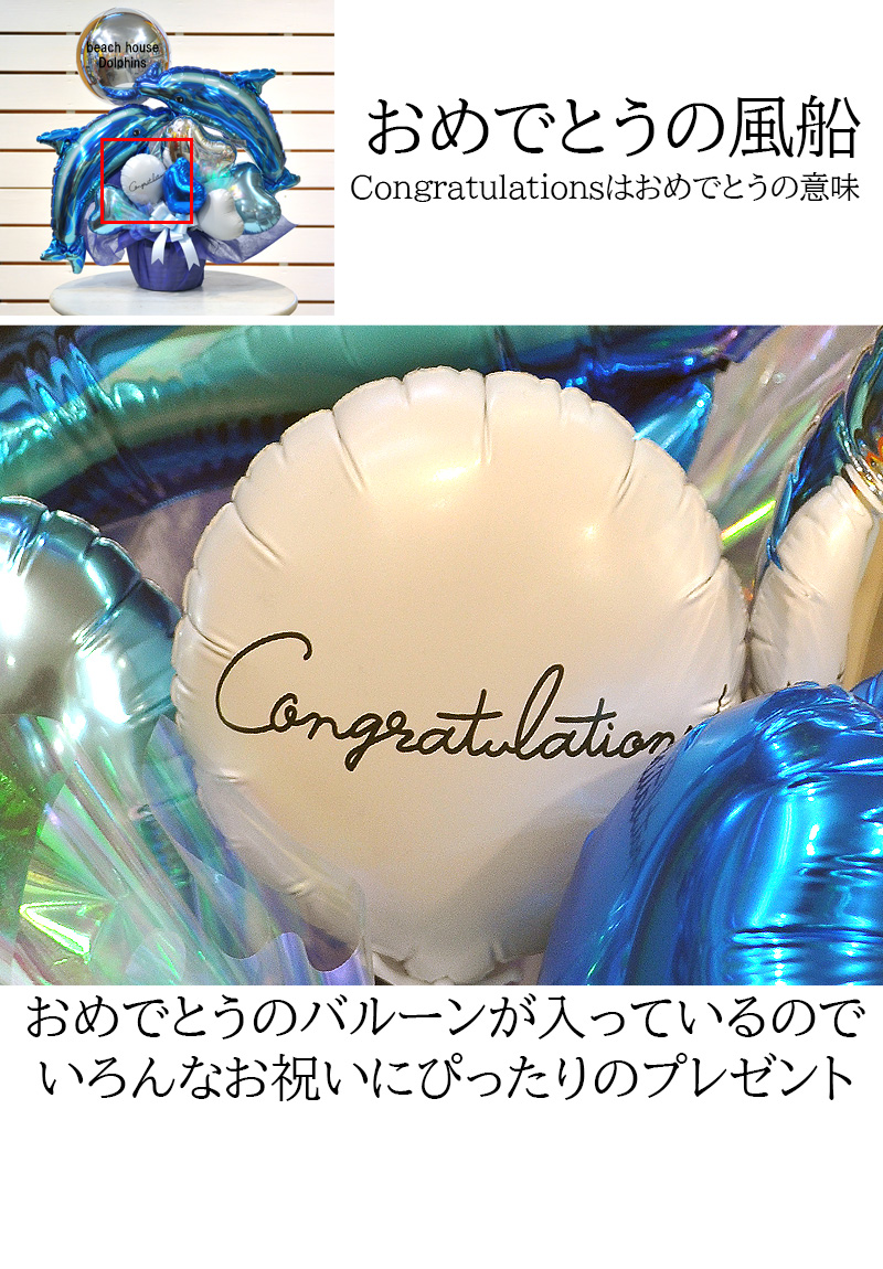 いろんなお祝いでご利用いただけるようにCongratulationsのバルーンが入っています。おめでとうの意味で使えますよ。