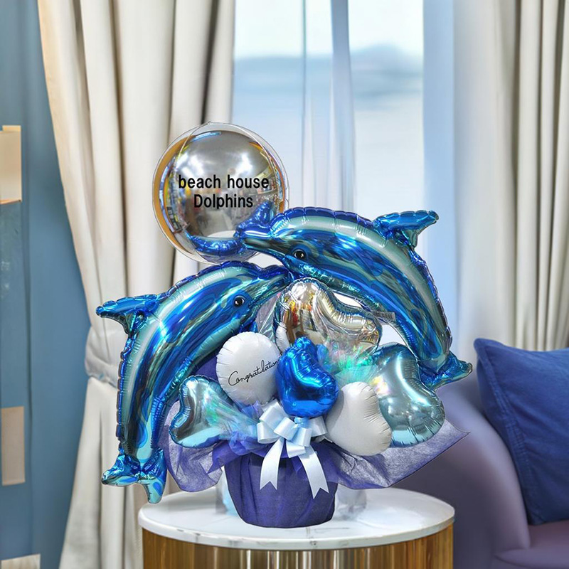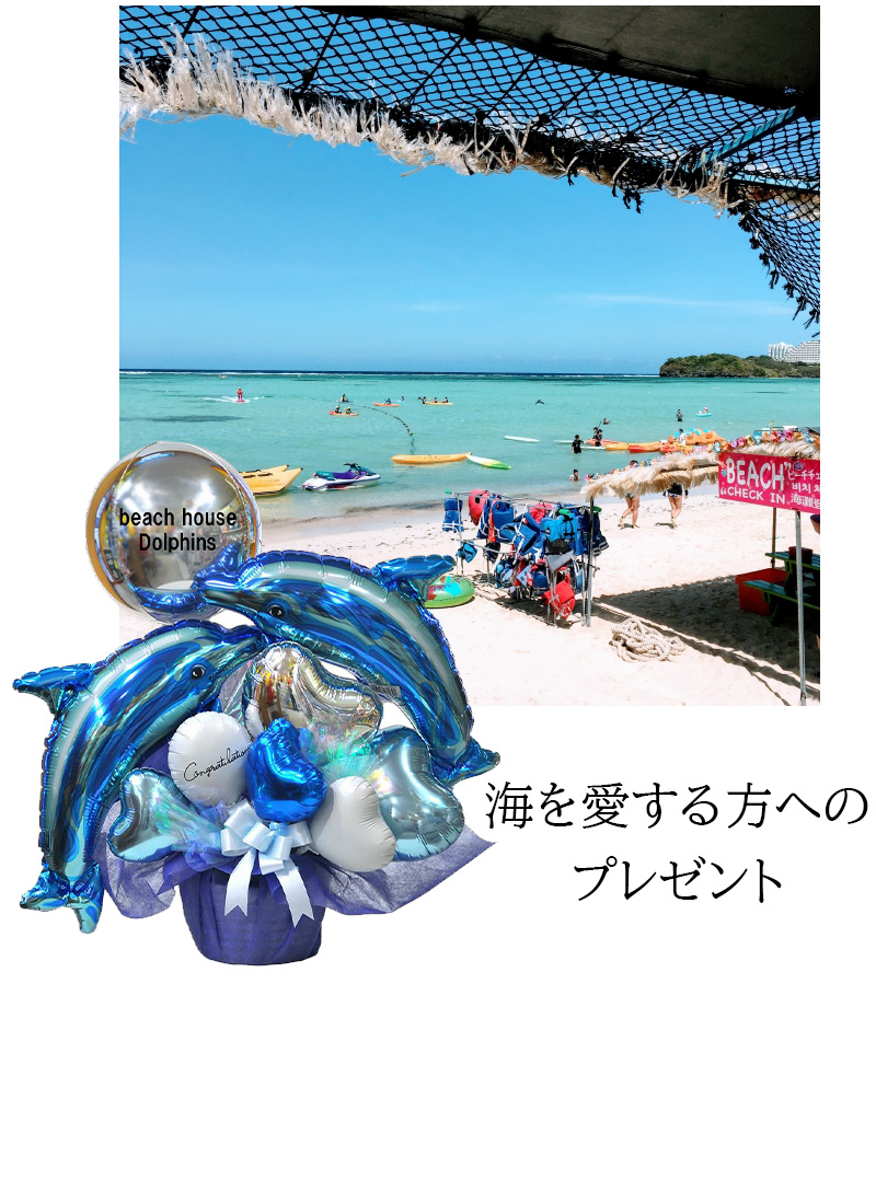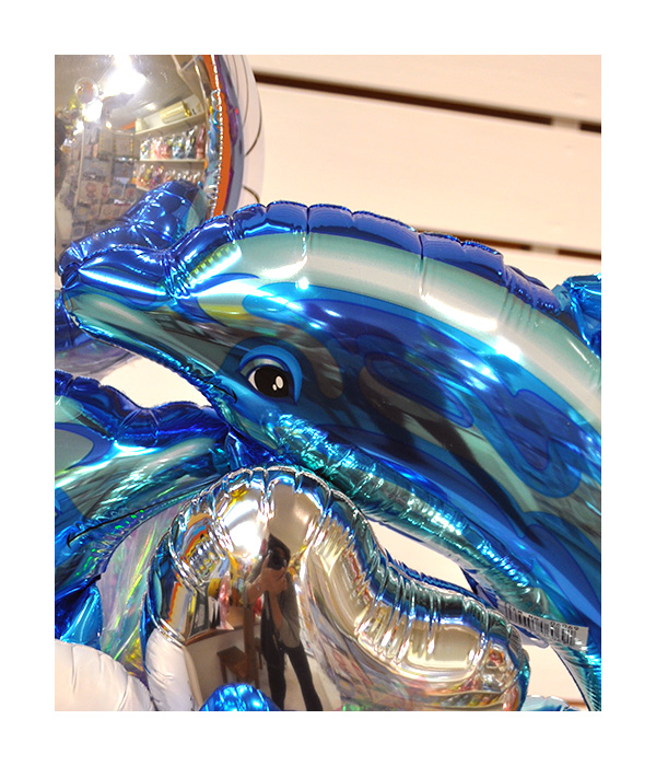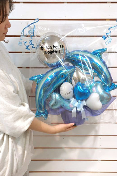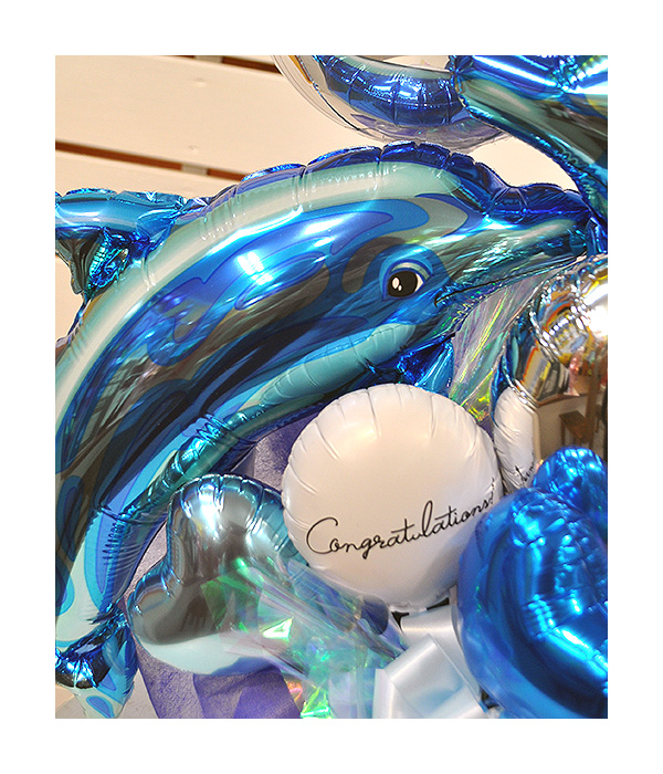 イルカのバルーンを使ってのアレンジメントです。もちろん年中人気のイルカちゃんたちですが、夏になると特に注目度アップ。青いきれいな色が涼し気なのもあるかもしれません。今回のアレンジメントには2頭も入れたで涼しさ倍増。名入れの球体のバルーンで遊んでいるような雰囲気を出してみましたよ。水族館などへのプレゼントにもおすすめですね。
