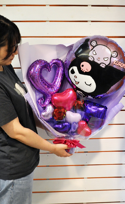 サンリオのクロミバルーンを使ってバルーン花束を作りました。もともと実店舗でとても人気があったこのクロミバルーン花束ですが、他県への発送をご希望されるお客様が多かったので、色々と工夫して箱に入るサイズにして今回デビューとなりました。花束タイプなのにテーブルの上で立ってくれるのがとても人気の理由です。クロミ好きの大人女子の皆様はもちろん、子供たちのギフトにもとてもおすすめです。
