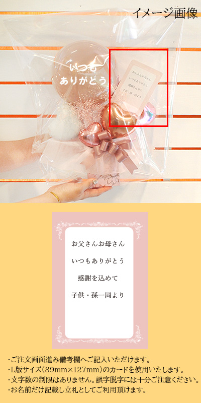 ・メッセージカードの内容記入は備考欄をご利用ください。 ・メッセージ内容は自由文(文字数制限なし)かもしくは文章例の選択も可能です。 ・誤字脱字には十分ご注意ください。 メッセージカード文章例 |